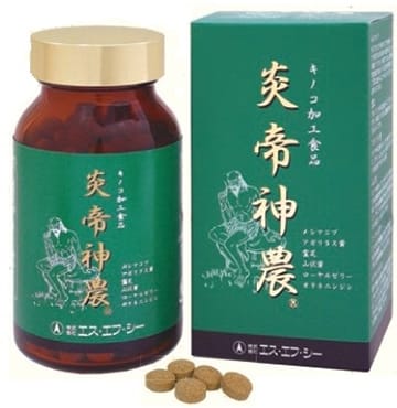 メシマコブ菌糸体エキス末、アガリクス茸末、霊芝(マンネン茸)末、山伏茸末の4つの薬用茸にオタネ人参、FD(フリーズドライ)-ローヤルゼリーを加え、食べやすく錠剤に仕上げてあり携帯に便利です。ちなみに、『炎帝神農』とは中国古代の伝説にある帝王で、百草をなめて医薬の基礎を創ったとされ、現在なお医薬の神として祀られています。